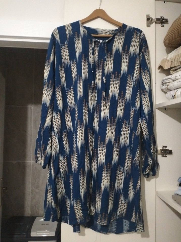 Mavi ve gri bağlama desenli, pile detaylı ve V yakalı uzun, bol kesim bohem tarzda tunik. Uzun kollu, yumuşak sentetik kumaştan yapılmıştır. 3XL sıfır ürün