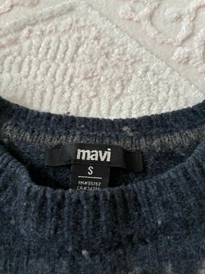 Mavi markalı, gri bağlamalı desenli, yün kazak. Tekne yaka, uzun kollu, rahat kesim, günlük ve sokak stili için uygun. Beden S.