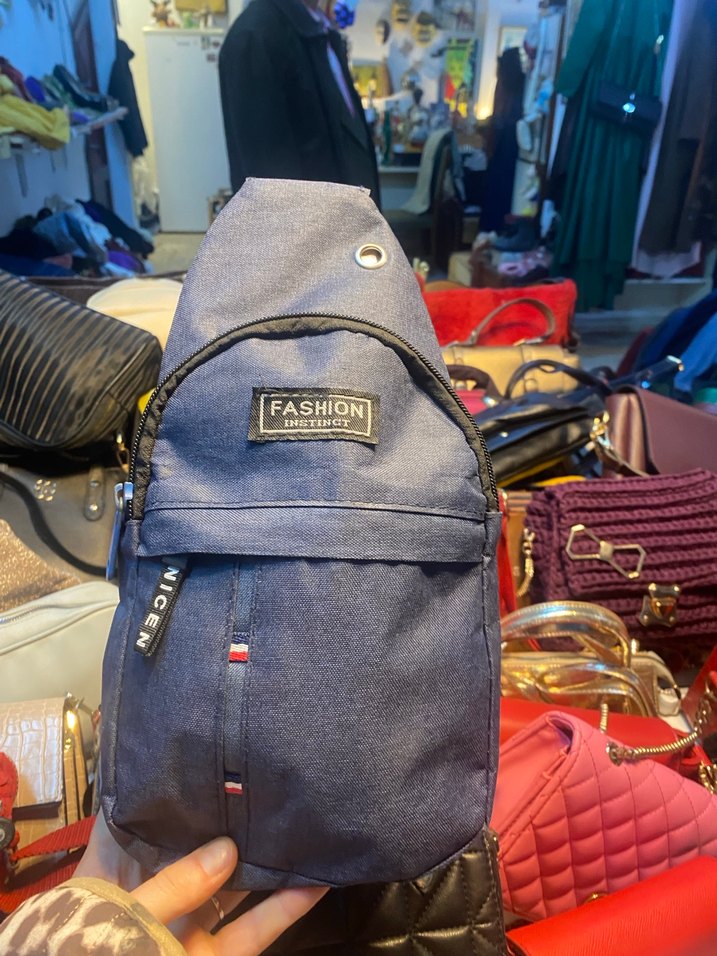 Mavi ve gri renklerde baskılı, fermuarlı cepleri olan erkek omuz çantası. "SHION" yazılı etiketi bulunur.