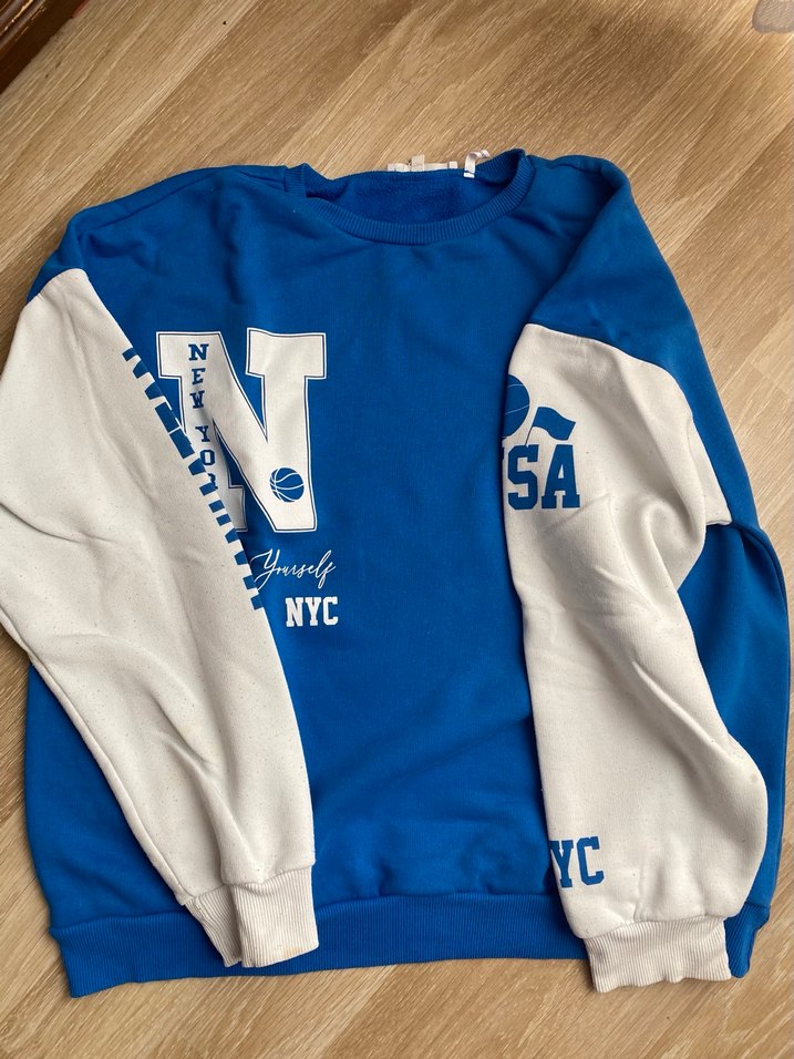 Mavi sweatshirt, gri uzun kollu baskılı detaylara sahiptir. Yuvarlak yakalı ve bol kesimdir, yumuşak ve sıcak kumaştan üretilmiştir. Kollarında hafif tülenmeler olmuştur .