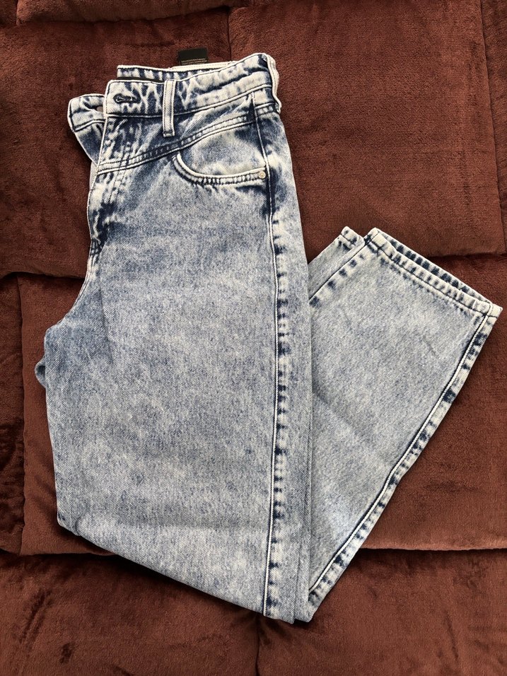 Gri batik desenli, düğmeli, rahat kesim ve normal boyda kadın kot pantolon. Günlük kullanıma uygun, denim kumaştan üretilmiştir.