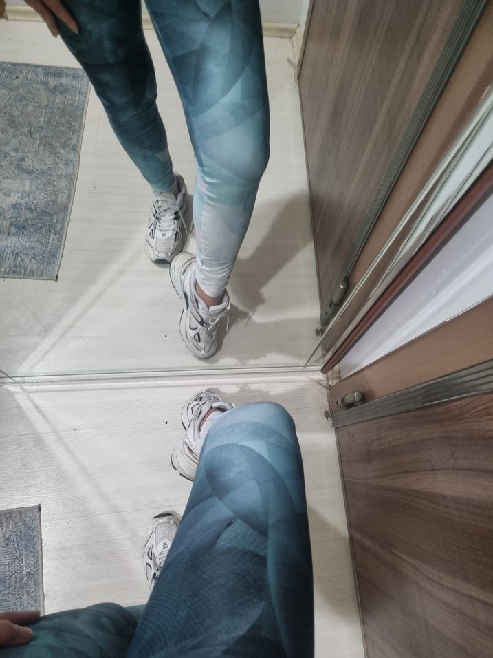Mavi ve gri batik desenli, elastik bel bantlı, sentetik kumaştan yapılmış, spor ve sokak stili için uygun kadın taytı. ♀️