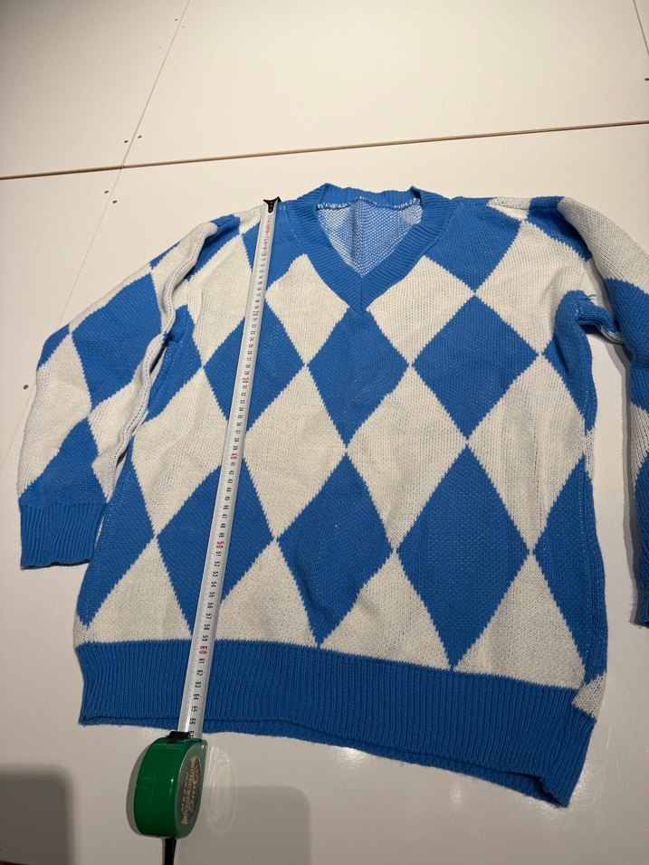 Erkek çocuk için mavi ve gri renklerde, V yaka, uzun kollu, gevşek kesim örgü kazak. Sokak stili için uygundur.