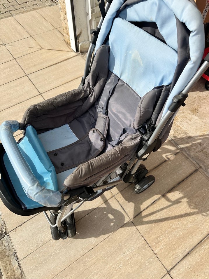 Mavi ve gri yumuşak kumaş oturma alanı, güvenlik kemerleri ve hafif çerçeveye sahip bebek arabası. Küçük tekerlekleri pürüzsüz zeminler için uygun.