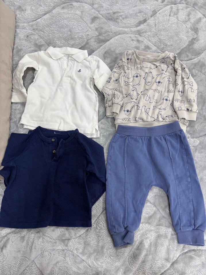 Pamuklu kumaştan, beyaz, lacivert ve desenli gri uzun kollu dört üst ile yumuşak mavi pantolondan oluşan bebek erkek takımı. Beyaz ve gri üstte ufak bir leke var belli belirsiz duruyor