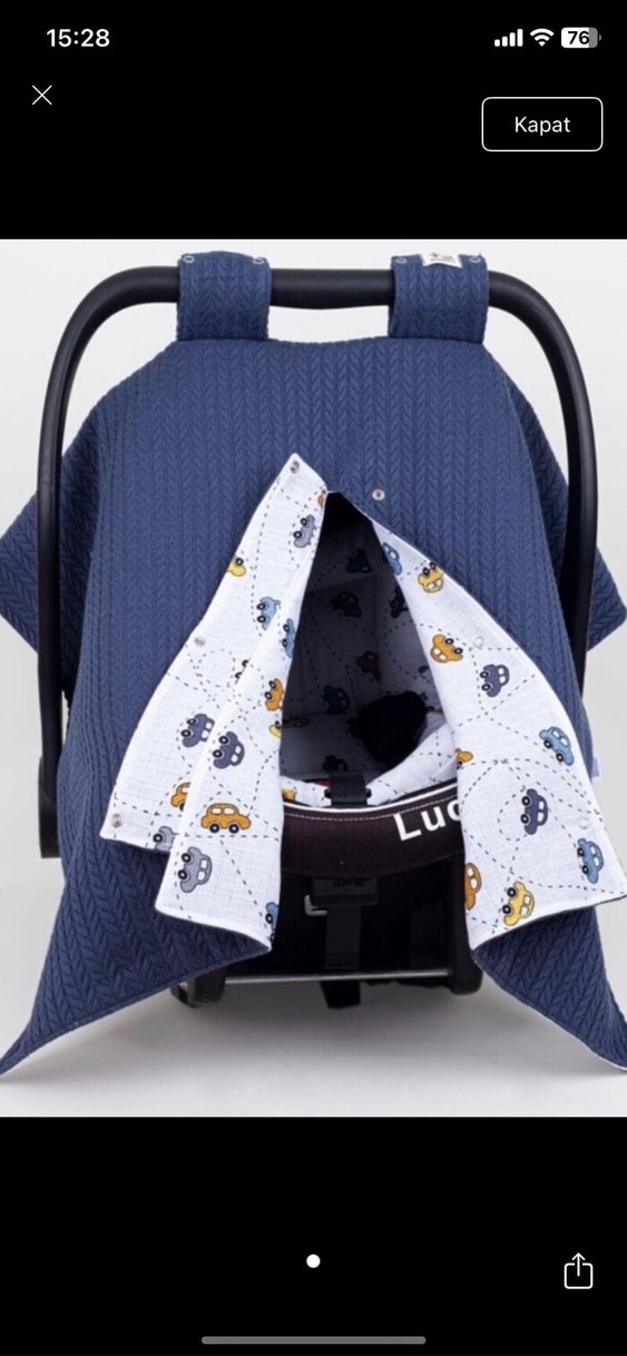 Mavi dış katman ve yumuşak gri kapitone kumaşlı bebek oto koltuğu örtüsü. İç kısmı renkli araba desenli, seyahatlerde konfor sağlar.