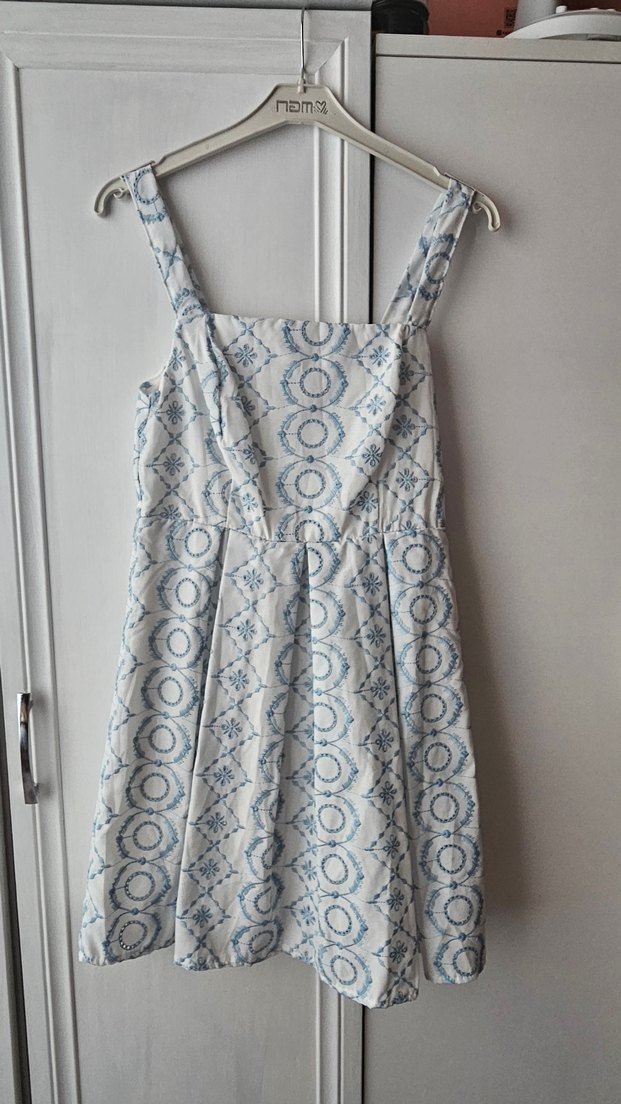 Mavi ve gri tonlarda, pileli detaylı, askısız yakalı, bağlama desenli bohem tarzda bol kesim mini elbise.