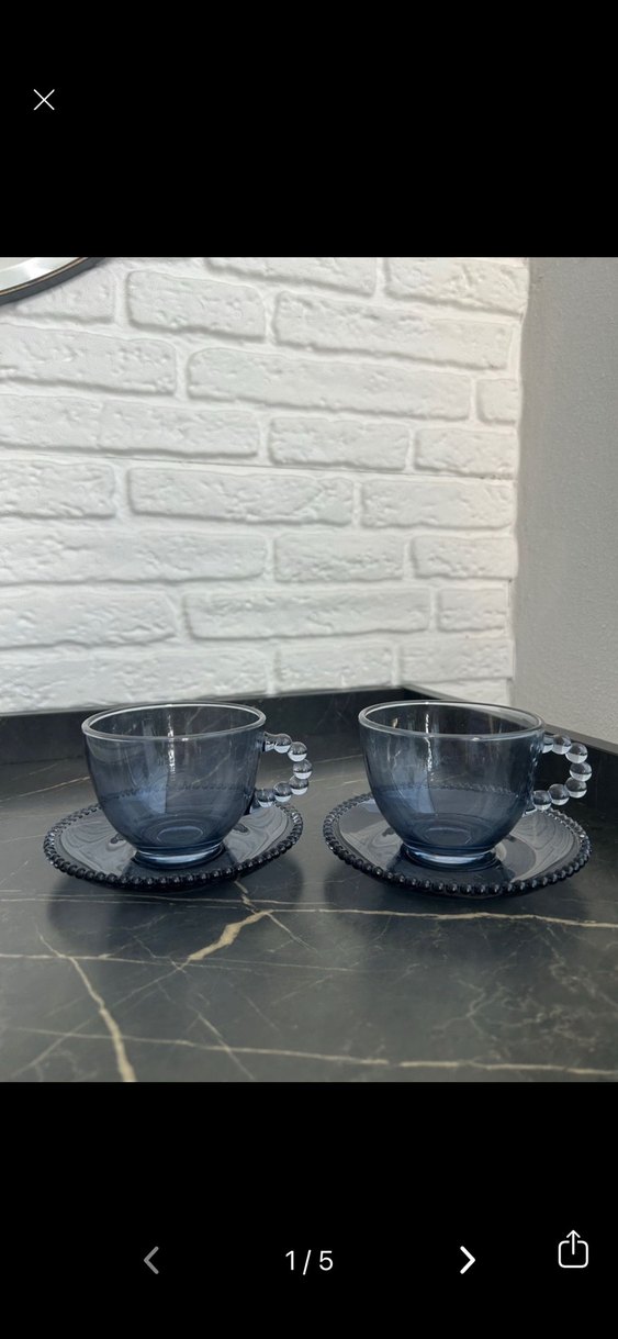 İki adet mavi gri cam fincan ve uyumlu tabaklardan oluşan set. Fincanların kulpları boncuk detaylı, tabakların kenarları dokulu. Çay ya da kahve sunumu için uygundur. ☕