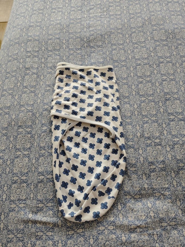 Yumuşak ve sıcak bebek kundak örtüsü, açık zemin üzerinde mavi ve gri çiçek desenlerine sahip.