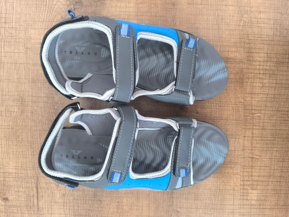 Mavi ve gri renklerde, cırt cırtlı kayışlarla ayarlanabilen 40 numara rahat taban erkek sandalet .