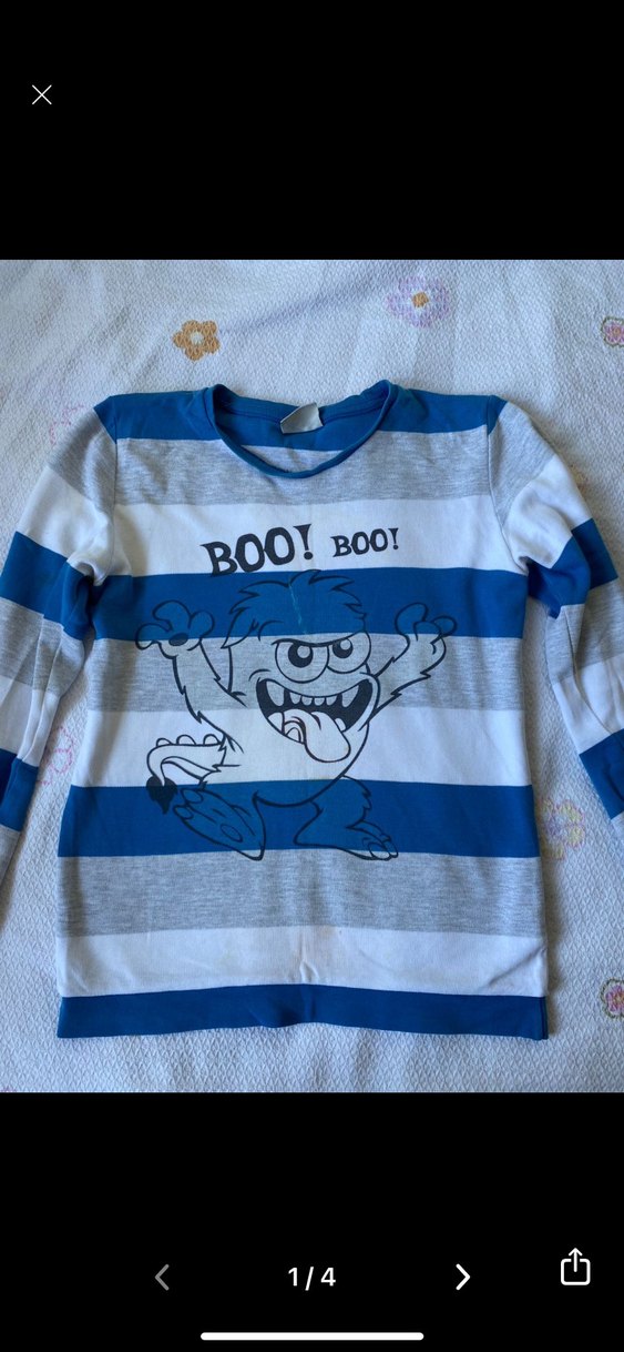 Pamuk kumaştan yapılmış, uzun kollu ve bisiklet yakalı, mavi ve gri çizgili, bol kesim erkek sweatshirt. "BOO! BOO!" yazılı canavar baskısı içerir