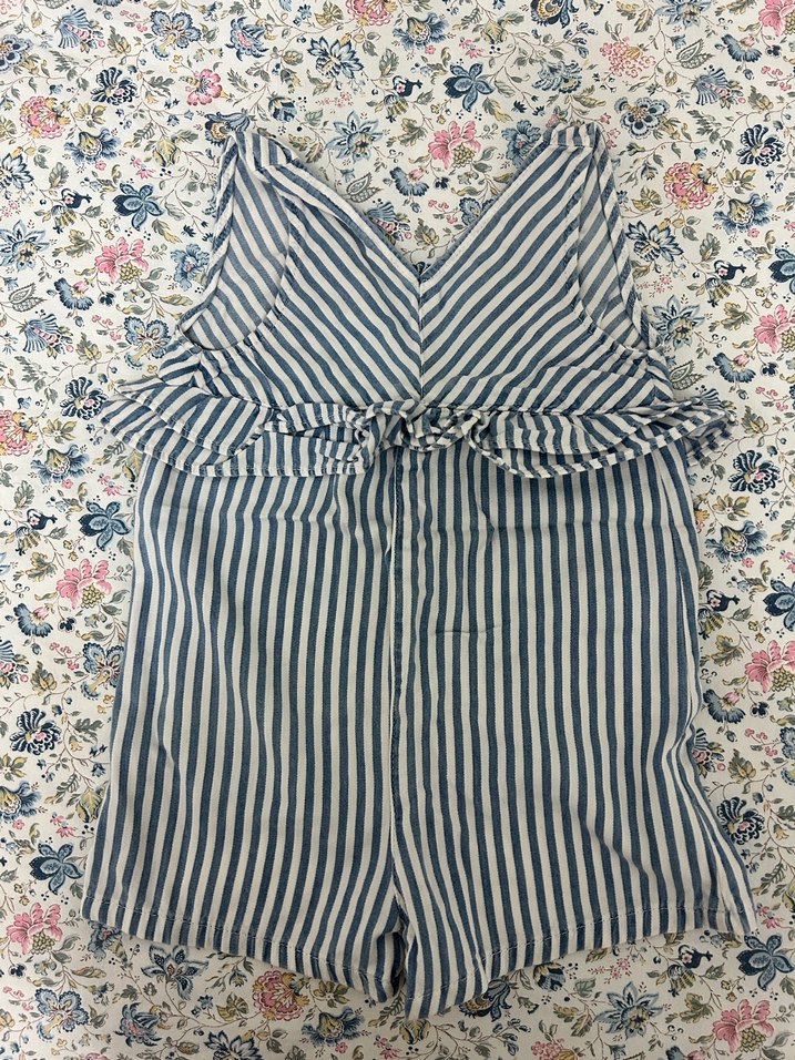 Mavi ve gri çizgili, bel kısmında fırfırlı bebek kız tulumu. Yumuşak kumaş ve kolsuz tasarım. Sıcak hava için uygun.