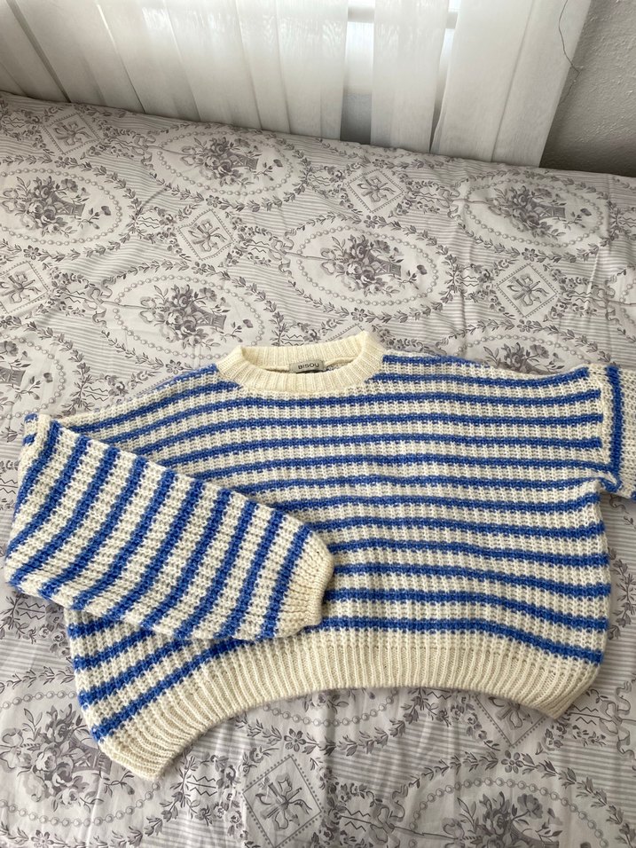 Mavi ve gri çizgili, uzun kollu, yuvarlak yakalı bol kesim kadın kazak. Rahat sokak stili için uygundur.