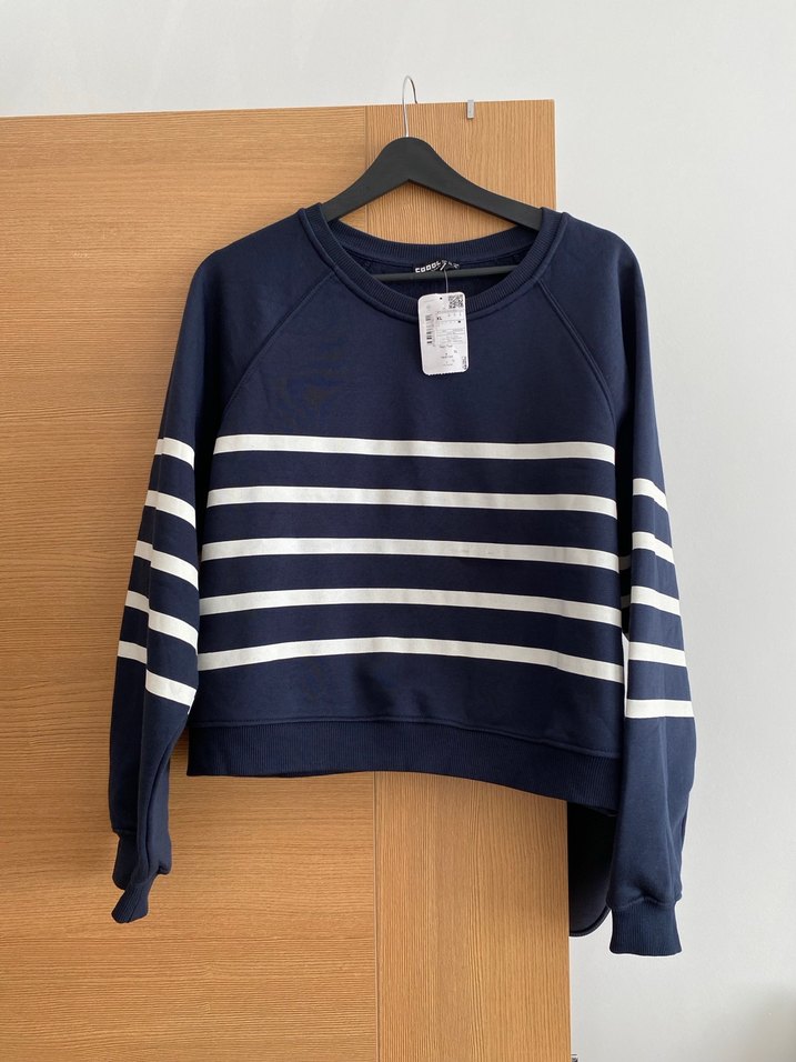 Mavi ve gri çizgili, yuvarlak yakalı ve uzun kollu kadın sweatshirtü. Rahat kesim ve normal boyda, yumuşak ve sıcak kumaştan üretilmiştir. Günlük kullanıma uygun, zahmetsiz şıklık sunar.