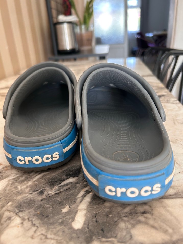 Mavi ve gri renkte, tokalı tasarıma sahip Crocs