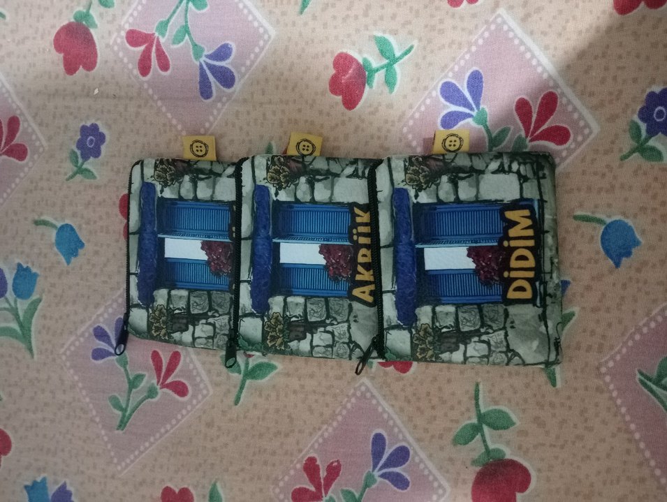 Mavi ve gri desenli çocuk cüzdanı, Velcro kapamalı ve sade tarzda, karşı kültür desenli.