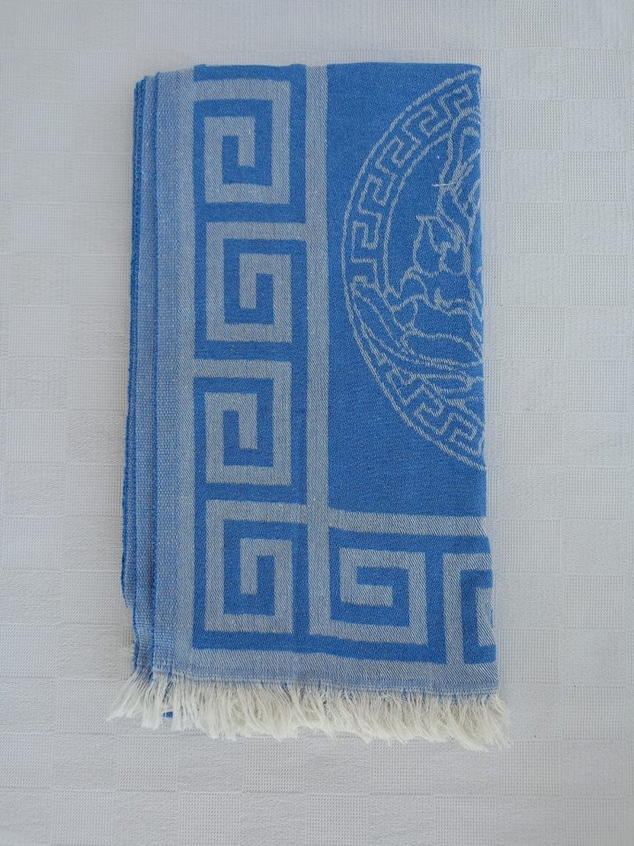 Uzun boylu, mavi ve gri geometrik desenli erkek Buldan peştemali, bohem tarzıyla günlük kullanıma da uygundur. müslin kumaştır, çift taraflı, iki katlı 185×100
