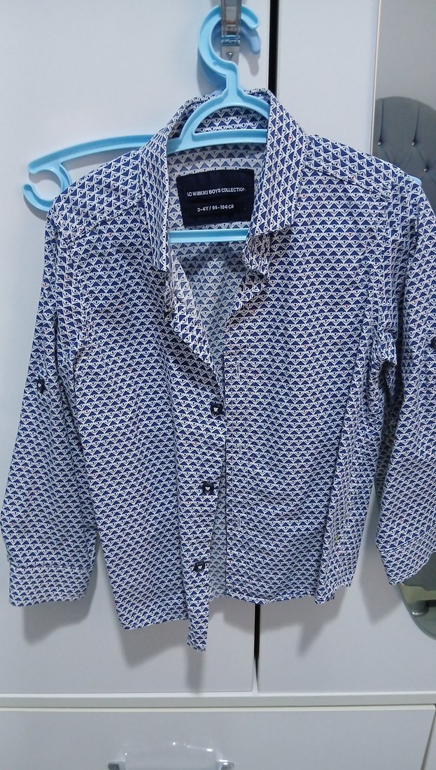Uzun kollu, düğmeli ve yakalı erkek çocuk gömleği. Mavi ve gri tonlarında baskılı, pamuk kumaştan yapılmış, normal kesim