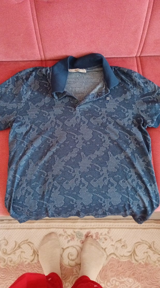 Düğmeli, yakalı ve bol kesim erkek polo tişört. Mavi ve gri desenli, denim kumaştan günlük ve sokak stiline uygun.