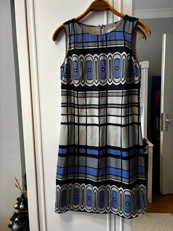 Kolsuz, tekne yaka ve pile detaylı midi elbise. Mavi ve gri renklerde baskılı, ofis için uygun regular fit model. Sayılı giyilmiş tertemiz kullanılmıştır sadece ön kısmında belirli belirsiz yatay bir ip çekilmesi mevcut onun haricinde hiçbir deformemesi yoktur şifon kumaştan iç astarlı çok kullanışlı bir model