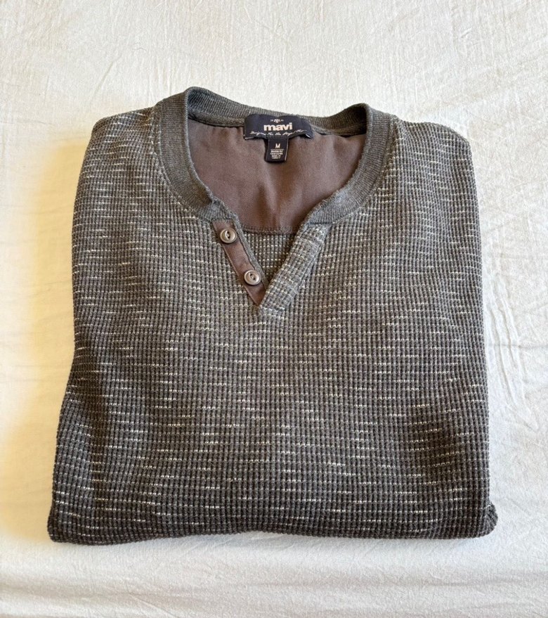 Düğmeli, uzun kollu, yuvarlak yaka, gri renkli yumuşak pamuklu kumaştan erkek triko kazak. Rahat kesimi ve sokak stiliyle günlük kullanıma uygundur.
