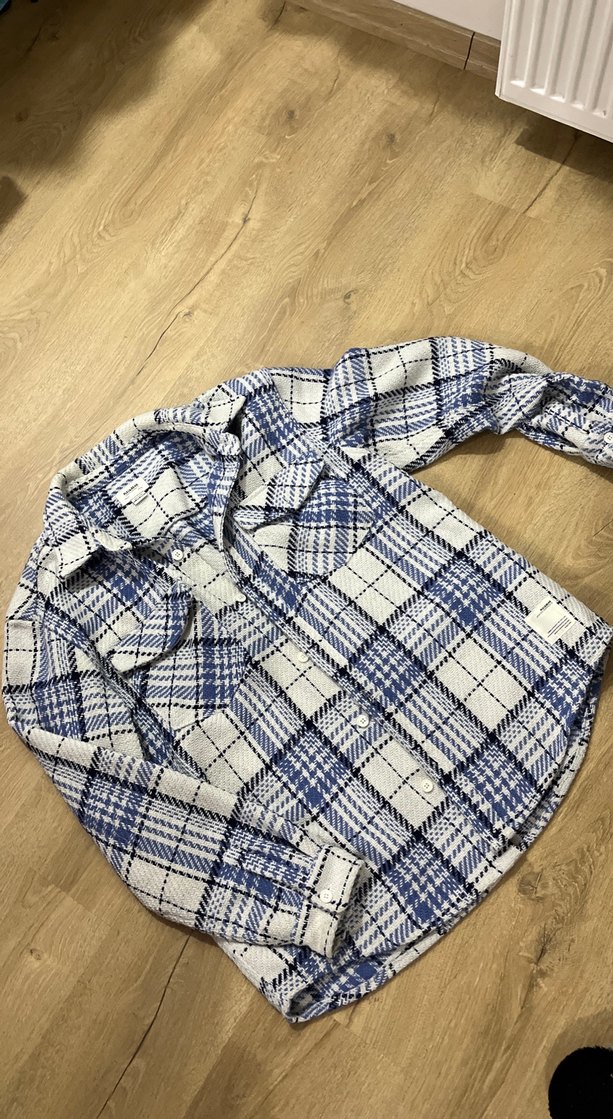 Mavi ve gri ekose desende, düğmeli, uzun kollu, rahat kesim ceket