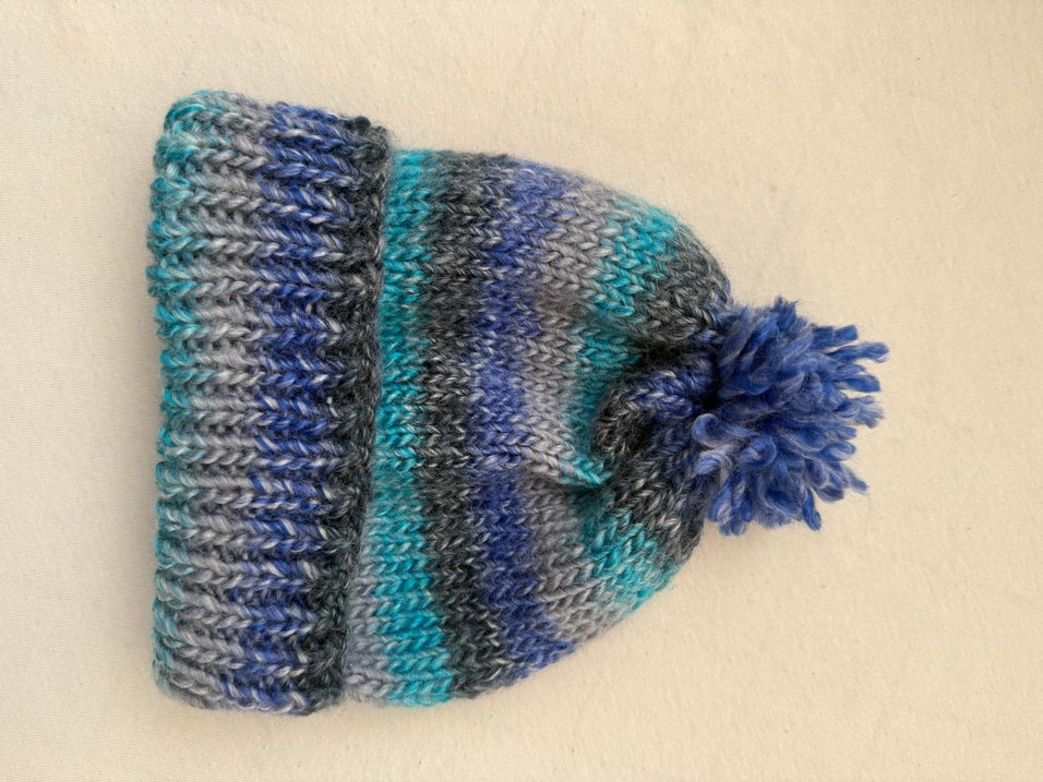 Mavi ve gri tonlarında örgü, ponponlu kadın bere, sade ve bohem tarzda, sıcak tutar.