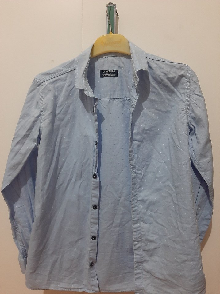 Mavi gri tonlarında, keten kumaştan yapılmış, yakalı, düğmeli ve uzun kollu erkek çocuk gömleği. Rahat kesimiyle gündelik sokak stiline uygundur.