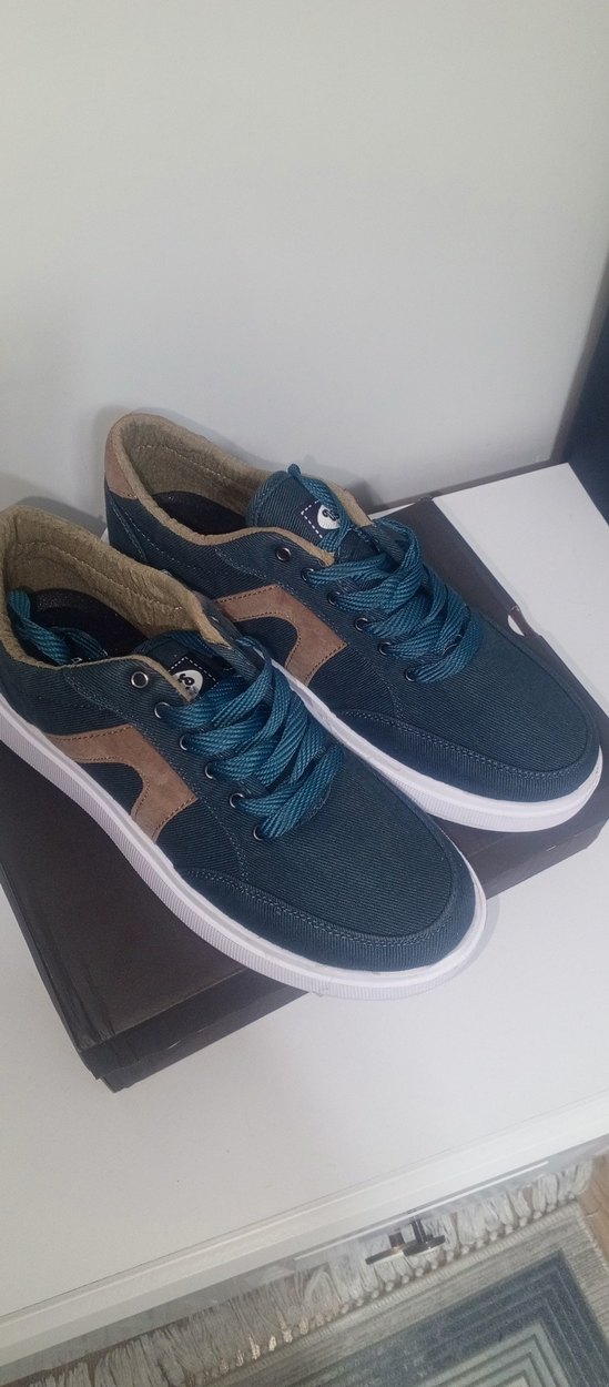Mavi ve gri renklerde baskılı, kaymaz kauçuk tabanlı, cırt cırtlı erkek çocuk spor ayakkabısı.