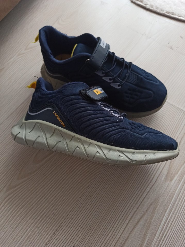 Mavi üst kısmı ve gri detaylarıyla erkek çocuk spor ayakkabısı. Kauçuk tabanlı, velcro kapamalı, rahat ve sokak tarzına uygun. Oğlum birkaç kez giydi ayağı hızlı büyüdüğü için küçüldü son fotoda defosunu göstermeye çalıştım fakat kullanıma engel değildir uygun yazıyorum