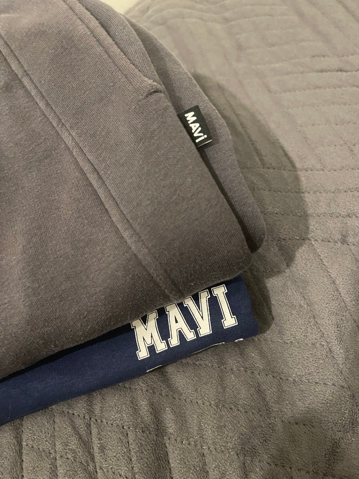 Mavi marka gri renk, fermuarlı cepli, baskılı desenli, yumuşak kumaştan, bol kesim ve normal boyda erkek sweatpant. İkisini bir göndericem