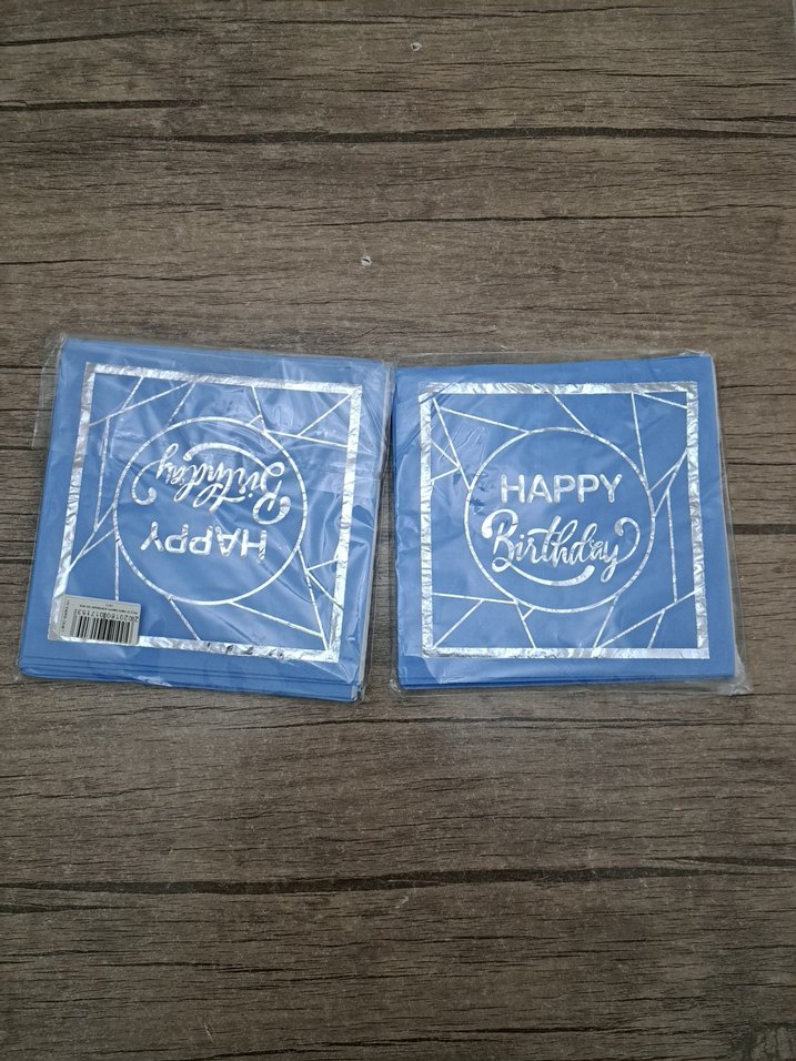 Mavi ve gri renklerde, "HAPPY Birthday" yazılı parti peçeteleri. Doğum gününde kullanılır