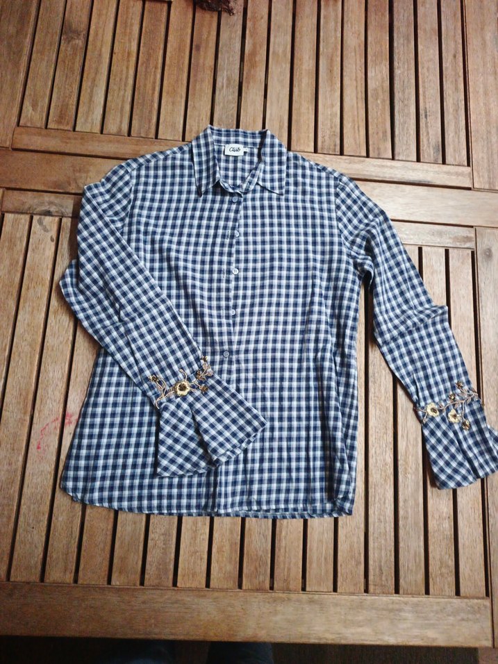 Düğmeli, uzun kollu ve kesik yaka detaylı bayan gömleği. Mavi ve gri kareli denim kumaştan, rahat kesim ve normal boyda, kollarda varak işleme detayı ile günlük sokak stiline uygun.