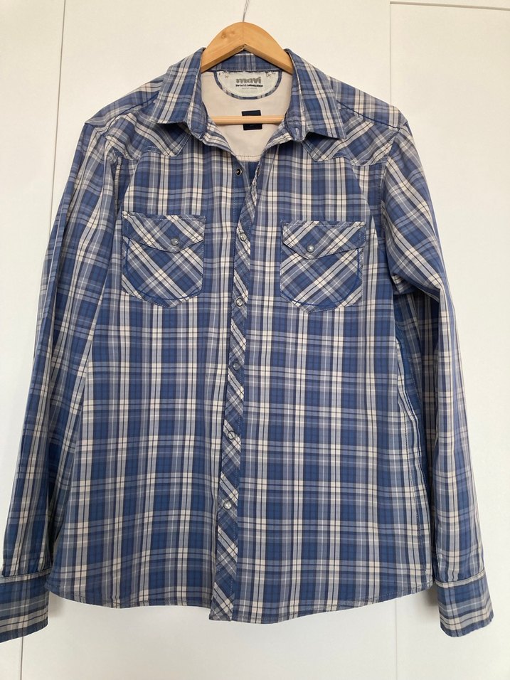 Düğmeli, uzun kollu, yakalı denim kumaştan yapılmış mavi gri kareli erkek gömlek. Günlük kullanım için rahat kesim ve sokak stili.