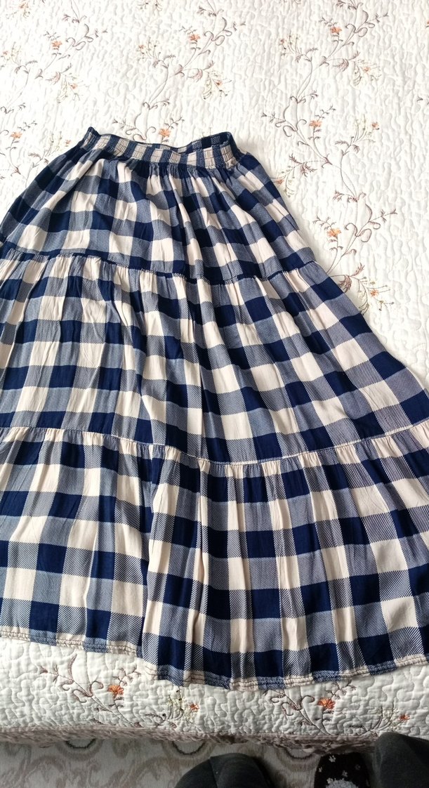 Mavi ve gri kareli, pamuk kumaştan yapılmış, bol kesim ve fırfırlı midi etek. Bohem tarzı için uygundur, günlük kullanımda rahatlık sağlar.