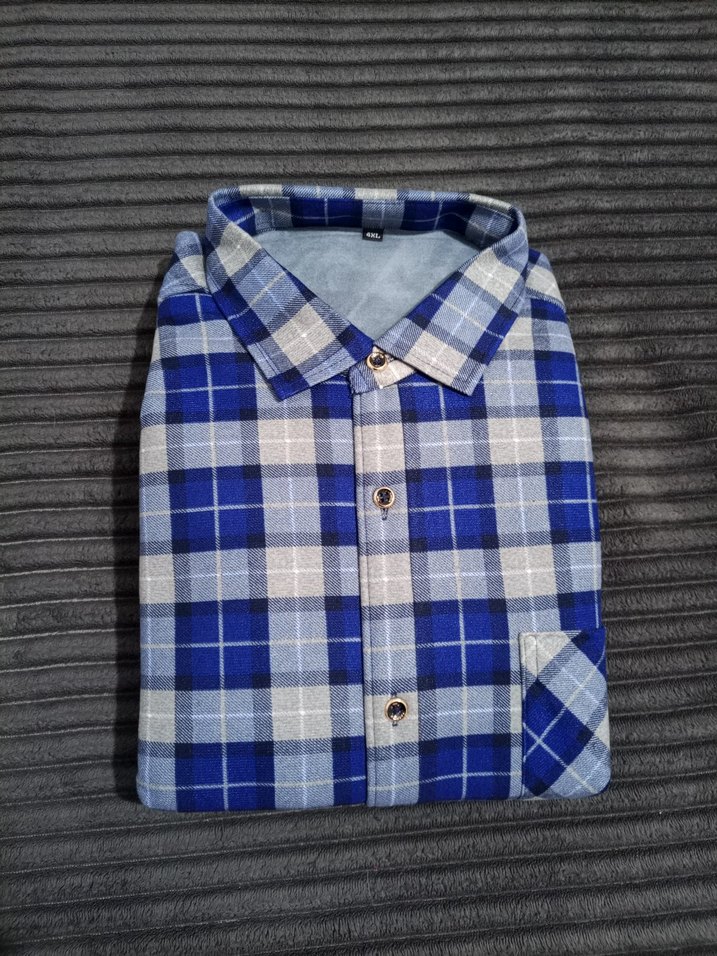 termal gomlektir Düğmeli, uzun kollu, yakalı erkek gömleği. Mavi ve gri kareli desenli, rahat kesim, yumuşak ve sıcak kumaştan üretilmiştir.