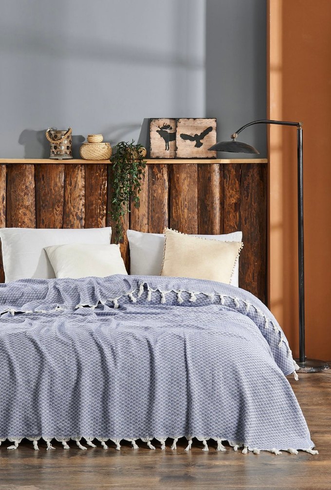 Mavi ve gri kareli desene sahip, kenarlarında püsküller bulunan yatak örtüsü, yatak odanıza dokulu ve sıcak bir görünüm kazandırır ️.