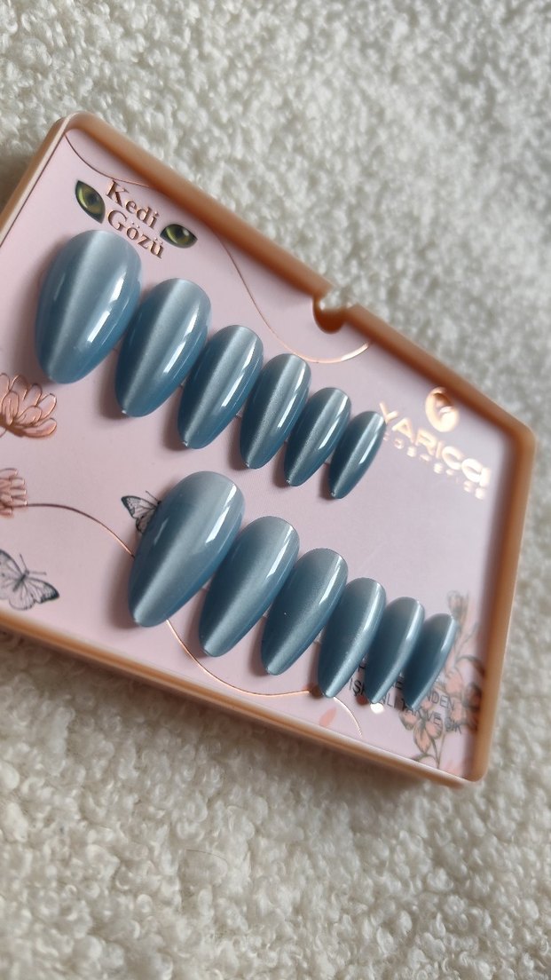 Mavi gri kedi gözü efektiyle parlak ve pürüzsüz yüzeye sahip takma tırnak seti. Tırnak görünümünüze şıklık katıyor. İçinde 12 adet takma tırnak ve tırnak yapıştırıcısı bulunmaktadır. Hiç kullanılmamış sıfır üründür ✨ Size çok yakışacağına eminim ✨