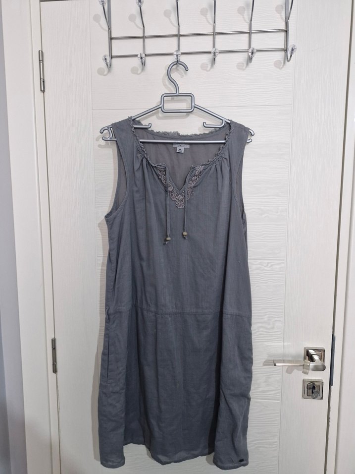 Gri keten kumaştan, kolsuz ve V yakalı midi elbise. Rahat kesimi ve drapeli detaylarıyla bohem tarzda, günlük kullanıma uygun. M bedendir.