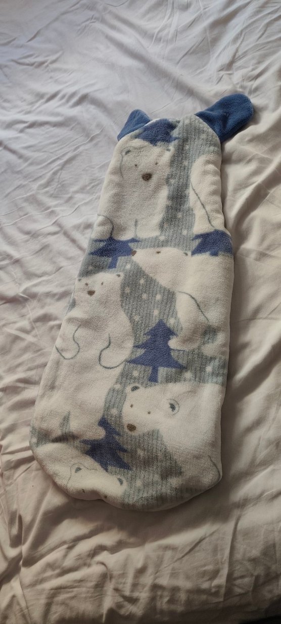 Yumuşak ve sıcak kumaştan yapılmış, mavi ve gri kutup ayısı desenli çocuk uyku tulumu, rahat uyku sağlar. ❄️0 3 ay arasi bebege uygundur