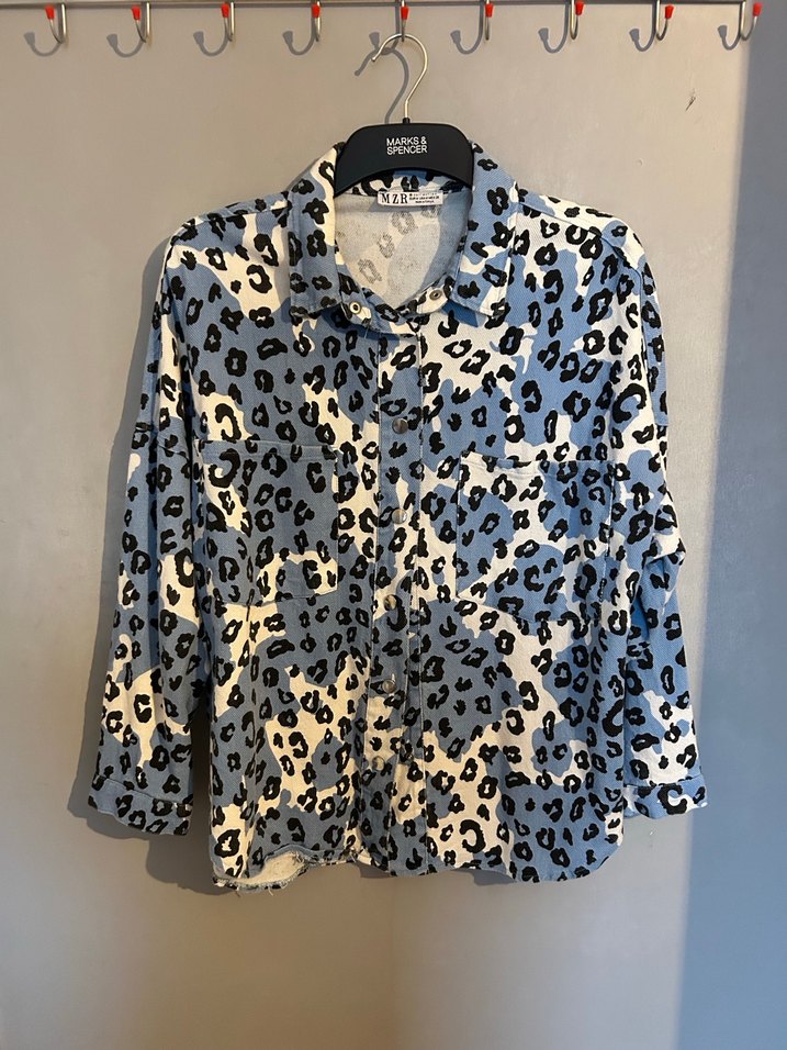 Mavi leopar desenli, yakalı, uzun kollu, düğmeli ve bol kesim kısa uzunlukta sentetik kumaştan gömlek Kumaşı kalın ve kışlıktır .