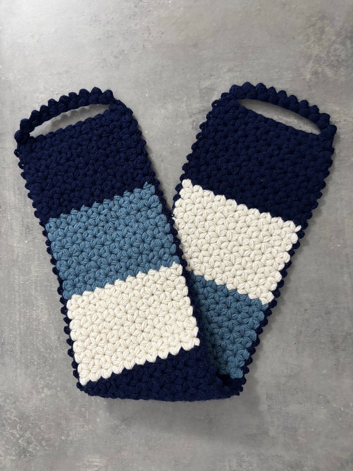 Mavi ve gri tonlarda, dokulu örgü tasarıma sahip, asma halkalı el yapımı banyo lifi