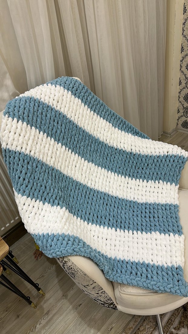 Mavi ve gri tonlarda geniş çizgili, yumuşak örgü çocuk battaniyesi, sıcaklık ve konfor sağlar.