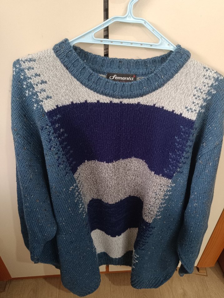 Örgü malzemeden yapılmış, bisiklet yaka ve uzun kollu, bol kesim normal boyda bir kazak. Mavi ve gri tonlarda rahat ve normcore tarzda, günlük kullanım için uygundur. Eni 62 boyu 70 cm esnektir