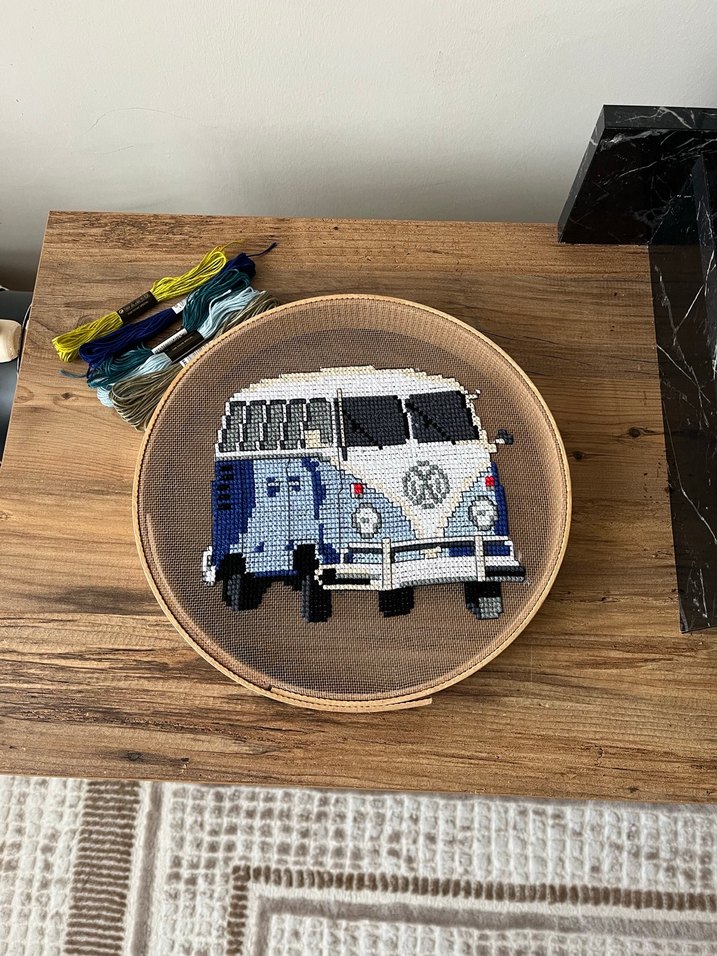 Mavi ve gri renklerde klasik bir minibüs tarzında nakış iplikleriyle yapılmış oyuncak araba deseni. Detaylı işleme için çeşitli iplik renkleri bulunur.