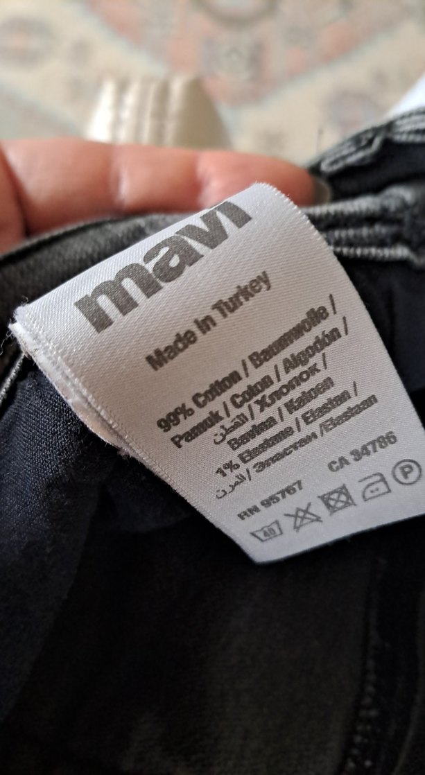 Mavi markasına ait gri erkek etiketi, %99 pamuk ve %1 elastan içerir. Birkac kez giyildi sadece, dar geldigi icin yayında.