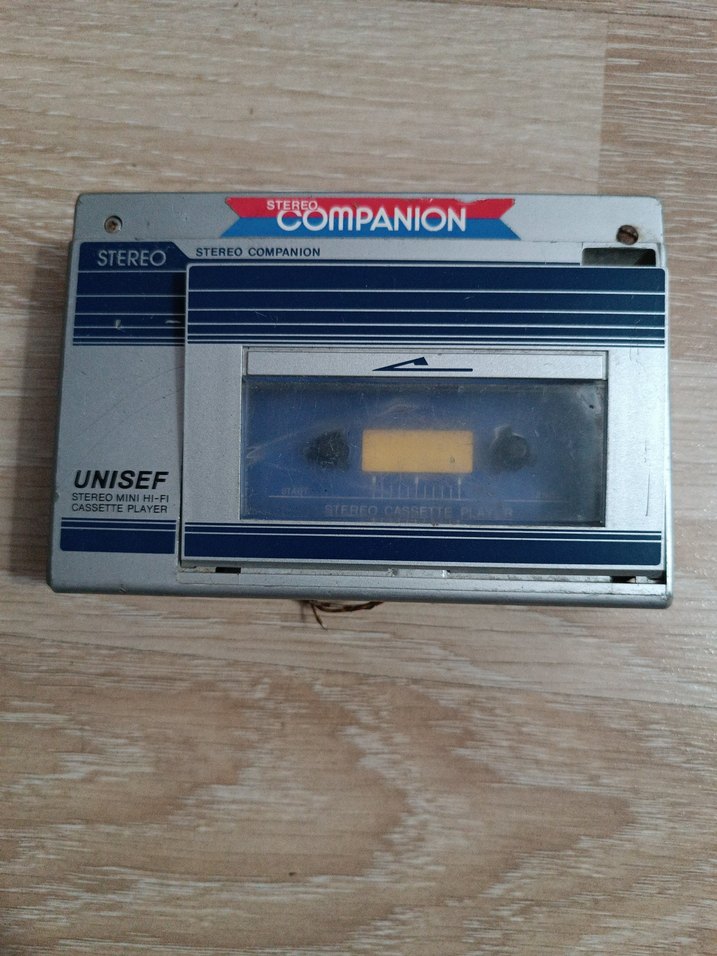 Mavi ve gri renklerde, temel kontrollere ve şeffaf kaset penceresine sahip stereo kaset çalar. UNISEF ve COMPANION marka isimleri bulunuyor.