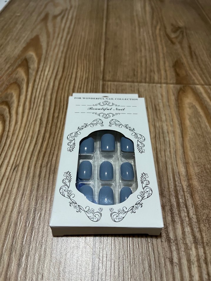 Parlak yüzeyli mavi ve gri takma tırnak seti, kolay uygulama için uygundur. 24 adet tırnak 24 adet yapıştırıcı bir adet törpü