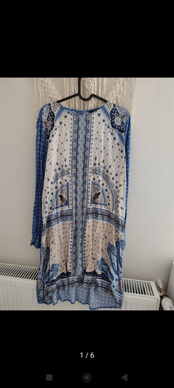 Mavi ve bej tonlarında, uzun kollu, salaş kesim ve bisiklet yaka uzun tunik. Yumuşak dokulu kumaştan yapılmıştır, günlük kullanıma uygundur. 1 kere kullanıldı