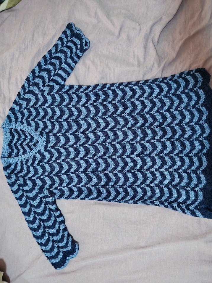 Mavi ve gri zigzag desenli, uzun kollu ve V yakalı, el örgüsü uzun kazak Bohem tarzda, günlük kullanıma uygun. Örgü mavi Omuzdan uca boy 75 cm iki koltuk altı arası40 cm